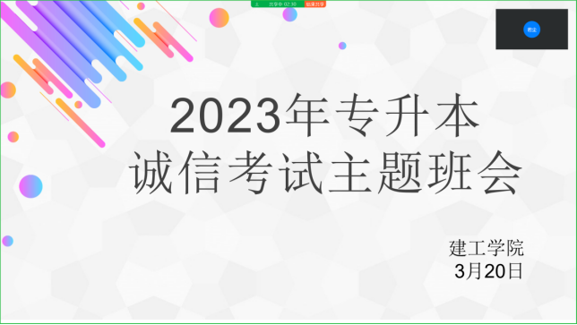 为做好2023年专升本考试相关工作,进一步加强学生考风考纪教育,引导学生诚信考试,坚决维护专升本考试公平公正,建工学院3月20日通过钉钉召开了2023年专升本考试诚信教育主题班会。本次会议参会对象分别为20级造专1、2、3班和20建专1-2班 参加专升本考试的同学,由辅导员马若尘和辅导员练威老师主持。