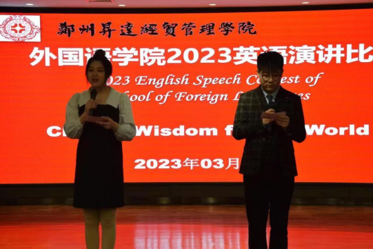 “演”绎传统文化,“讲”述外语风采。为了促进外国语学院学生学习英语的热情,2023年3月16日,由外国语学院承办的2023“China's Wisdom for the World ”主题英语演讲比赛在实训楼 A座顺利举行,并设置了各级奖项。风采不凡的大二大三同学在演讲的舞台上大放异彩,各显实力。此次比赛拉近了英语课堂与学生生活的实际距离,提高学生的英语应用水平和交际能力。