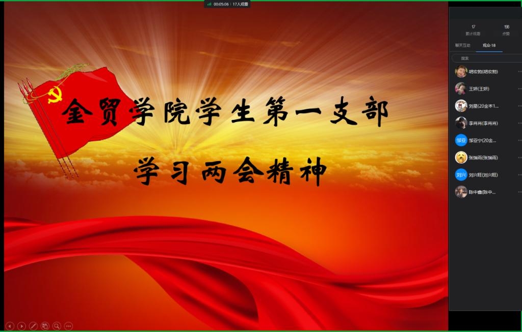 为进一步学习和贯彻党的二十大报告以及两会精神,金融贸易学院学学生第一党支部于3月20日在线召开全体党员会议,会议由支部书记杜留荷主持。