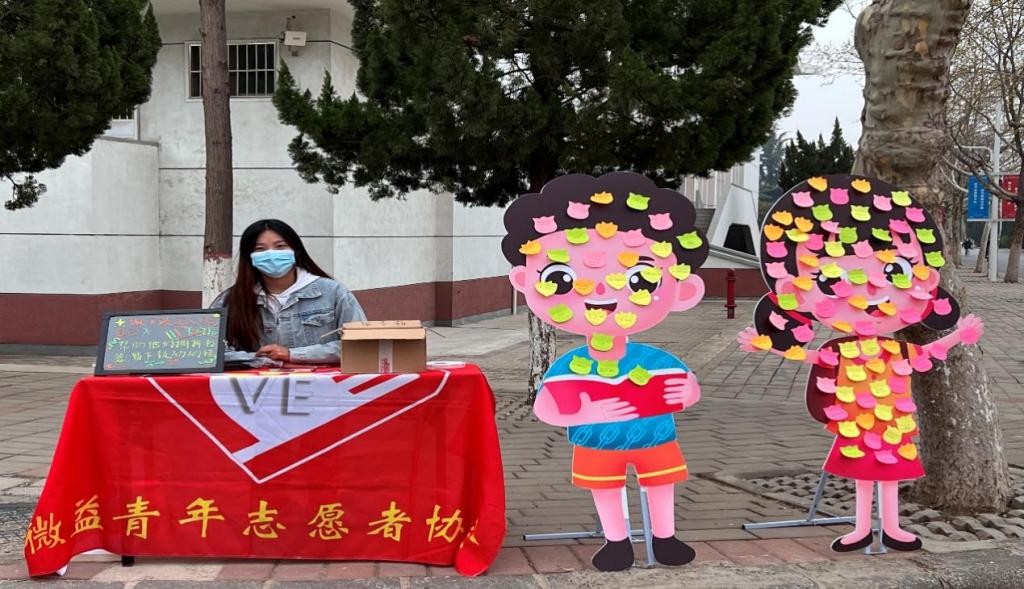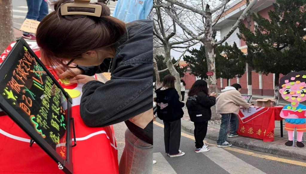 下午时分,社团成员早早的在活动场地布置,为活动的开展做好准备。社团成员通过DIY的小黑板吸引经过的学生驻足观察,并让同学积极参与进来,撕下展板上的标签并写下鼓励自己或者他人的话语,畅所欲言,互相鼓励。