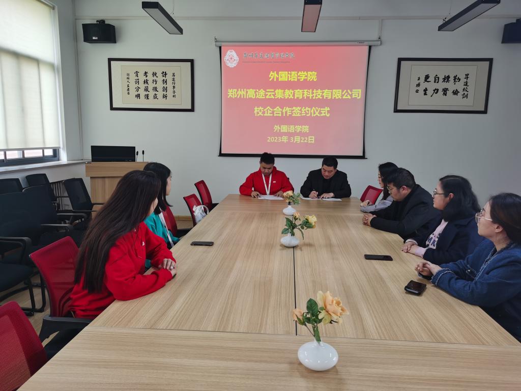 为了深化校企合作,助力毕业生高质量就业,外国语学院于2023年3月22日下午,在教学一号楼206会议室,与郑州高途云集教育科技有限公司举行校企合作签约仪式。外国语学院院党委书记石皓召,英语教研室苏小强、王倩倩、郭真老师及2023届毕业班辅导员出席了此次签约仪式。