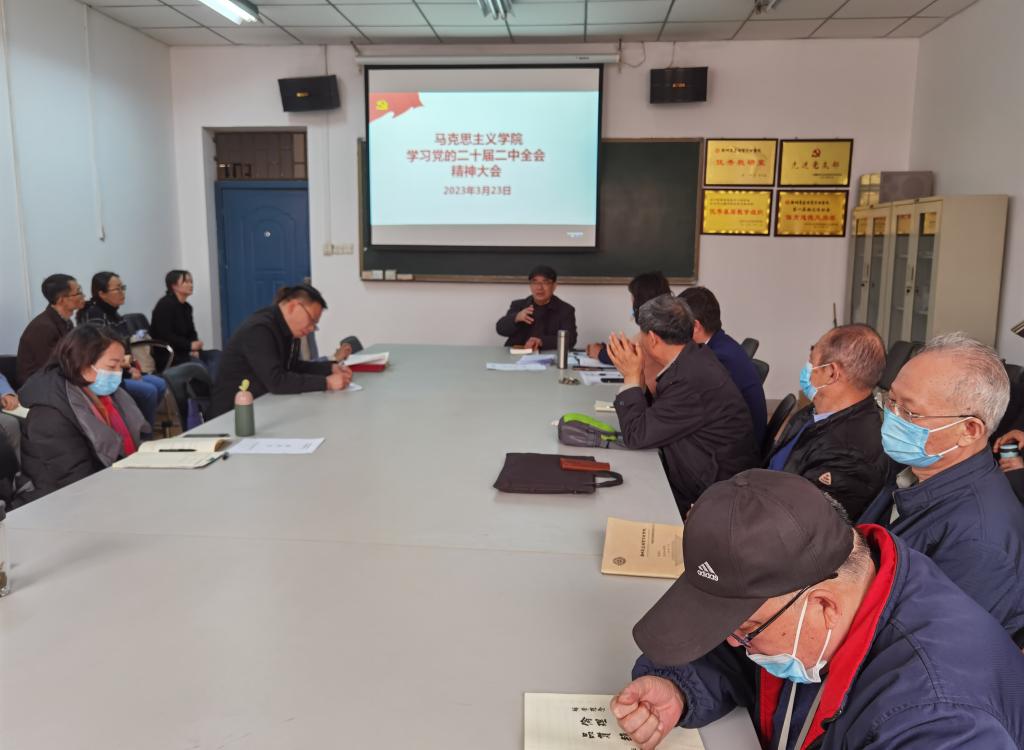 3月23日,综合楼211会议室,马克思主义学院组织全体教师认真学习党的二十届二中全会精神。毛枳鑫副教授为大家作《学习二中全会精神坚定不移深化机构改革》专题报告。
