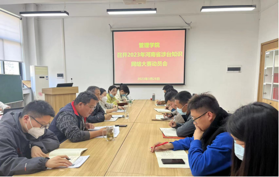 为进一步深入学习宣传贯彻党的二十大精神,扎实做好学习宣传二十大精神和涉台宣传教育工作,管理学院3月28日下午14:00在教学二号楼305召开2023年河南省涉台知识网络大赛动员会。管理学院党委书记职正路、行政秘书许广庆以及全体辅导员参加了此次会议。