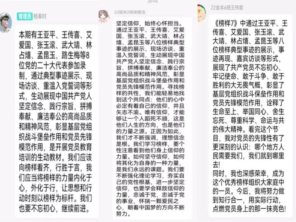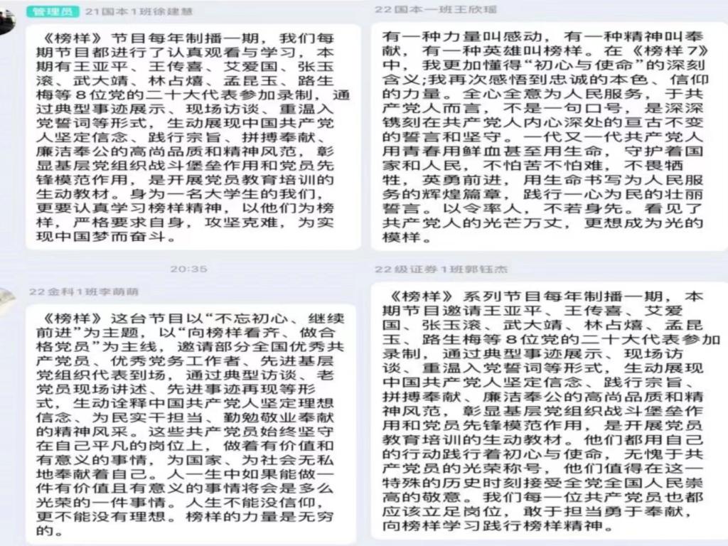 为深入学习贯彻习近平新时代中国特色社会主义思想和党的二十大精神,2023年3月25日晚8点,金融贸易学院党委组织师生观看由中央组织部和中央电视总台联合制作的专题节目《榜样7》。