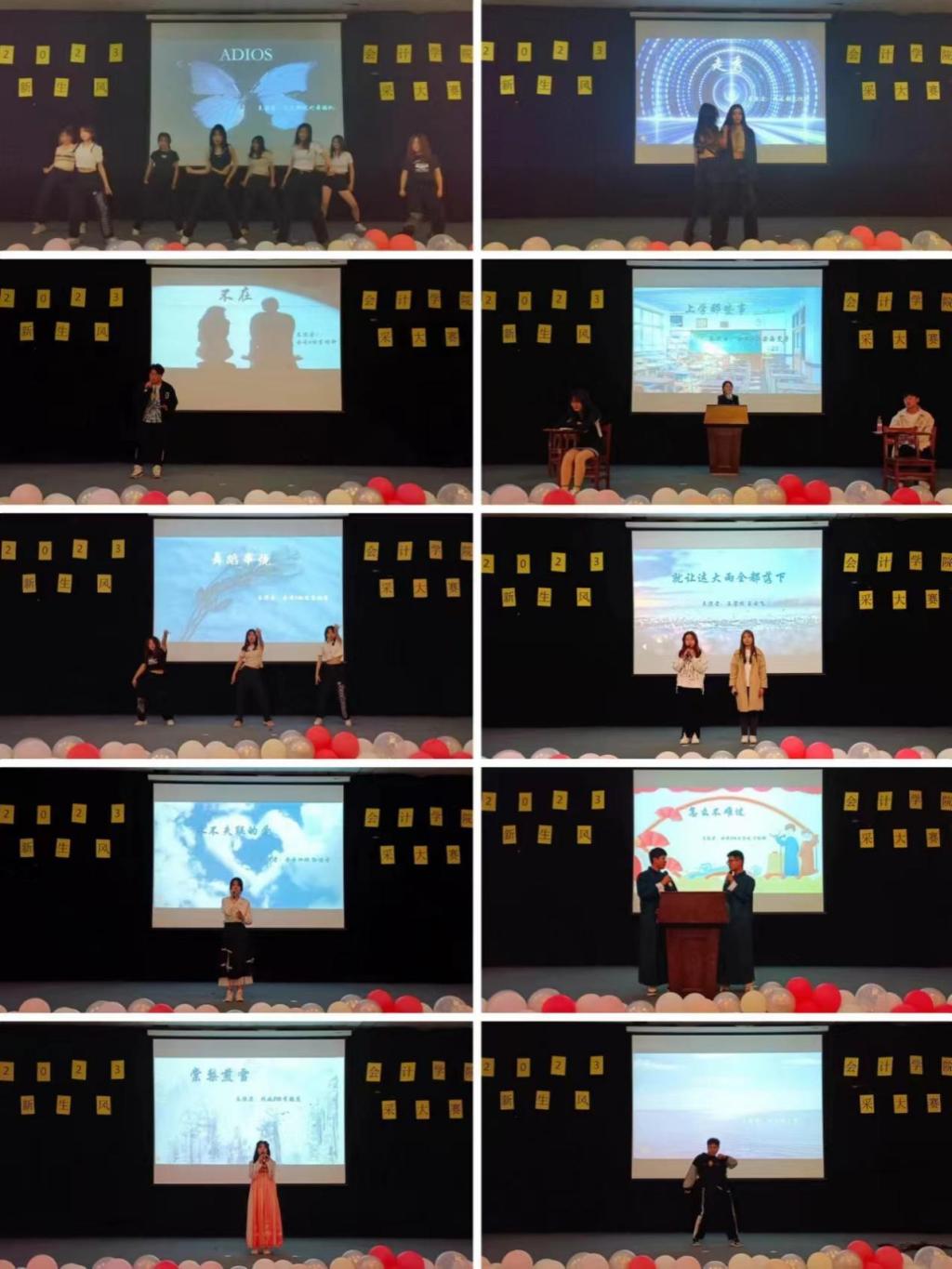 首先,由文艺部现代舞蹈队带来开场舞蹈《Adios》,优美的舞蹈使现场气氛迅速升温;接下来由22级会专6班李明轩带来歌曲《不在》,无不让现场观众沉浸在音符跳动中;22级会本5班陈慧娴的《舞蹈串烧》尽显青春的活力和魅力;22级会专4班孙佳音的歌曲《永不失联的爱》让观众在歌声中对爱有了更深层次的理解;由22级税收2班李颖慧带来的《棠梨煎雪》给大家更进一步的听觉享受;由风采部礼仪队带来的节目《走秀》成为活动中的一场视觉盛宴;由22级会本4班梁嘉雯等带来的小品《上学那些事》使台下观众回到过去青涩而美好的青春岁月;由22级会专6班王馨悦、王云飞带来歌曲《就让这大雨落下》,轻灵曼妙的歌声使观众沉浸在歌曲的一字一句中;由22级财本3班王子凡、刁纪璇带来的双人相声《怎么不难过》不断抖出包袱使现场笑声不断、掌声不绝;最后由风采部干事带来的舞蹈串烧收尾。至此,本次活动圆满结束。
