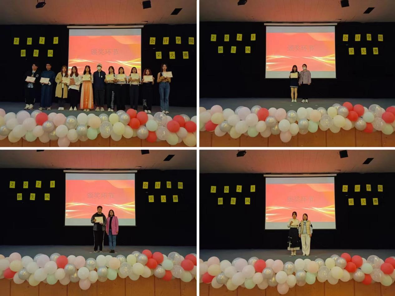 接下来到了令人激动的颁奖环节,由第27届风采部部长原鹏为优秀奖获得者文艺部现代舞队、22级会本5班陈慧娴、22级税收2班李颖慧、风采部礼仪队、22级会专6班王馨悦、王云飞、22级财本3班王子凡、刁纪璇、22级会专6班李明轩颁奖并合影留念;由姜早阳老师为三等奖获得者22级会本4班梁嘉雯等颁奖并合影留念;由蔡艳丽老师为二等奖获得者22级财本2班陈新政颁奖并合影留念;由支圆圆老师为一等奖获得者22级会专4班孙佳音颁奖并合影留念。