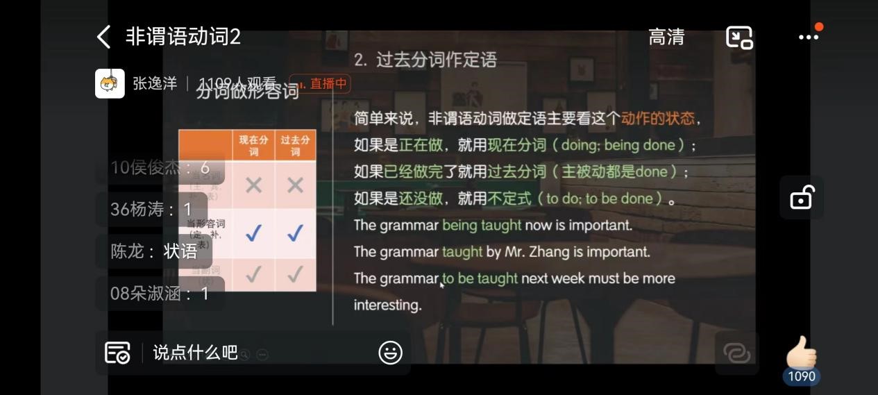 其次,张老师详细讲解了现在分词作定语和动名词作定语,过去分词作定语,分词做补语或表语以及分词作状语。在讲解过程中,根据易混淆点和出错点,张老师着重强调了现在分词和动名词的区别,通过具体示例和互动帮助同学们理解了二者之间的不同。