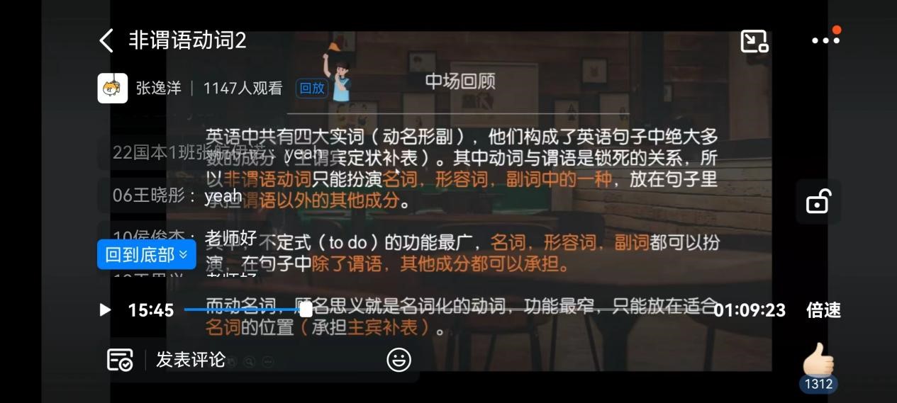 为助力2022级学生英语语法水平的提高,备战未来大学英语四级考试,基础部在5月5日晚19:00-20:30开展了英语语法系列专题辅导讲座第四讲,主题为非谓语动词,主讲教师为张逸洋老师。近1200名同学在线认真观看了本次讲座,本次讲座主要内容为非谓语动词中的现在分词和过去分词。