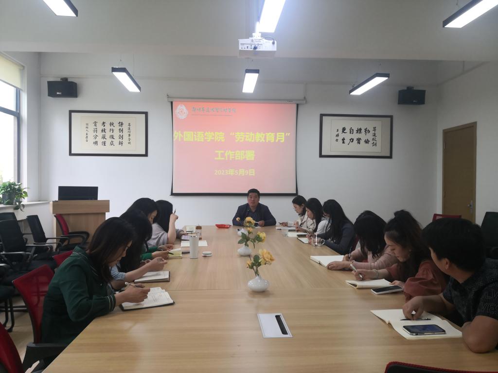 2023年5月9日,外国语学院在教一楼206院会议室召开“劳动教育月”工作部署会,以“礼赞劳动,赋能成长”为主题,旨在弘扬勤俭、奋斗、创新、奉献的劳动精神,坚持以习近平新时代中国特色社会主义思想为指导,全面贯彻党的教育方针,培养德、智、体、美、劳全面发展的综合素质人才,引导学生树立正确劳动观,提高劳动积极性,外国语学院党委书记石皓召主持会议,行政秘书丁玥以及各位辅导员老师参会。