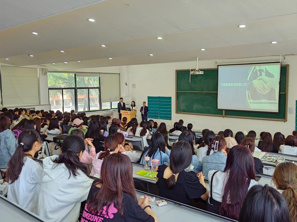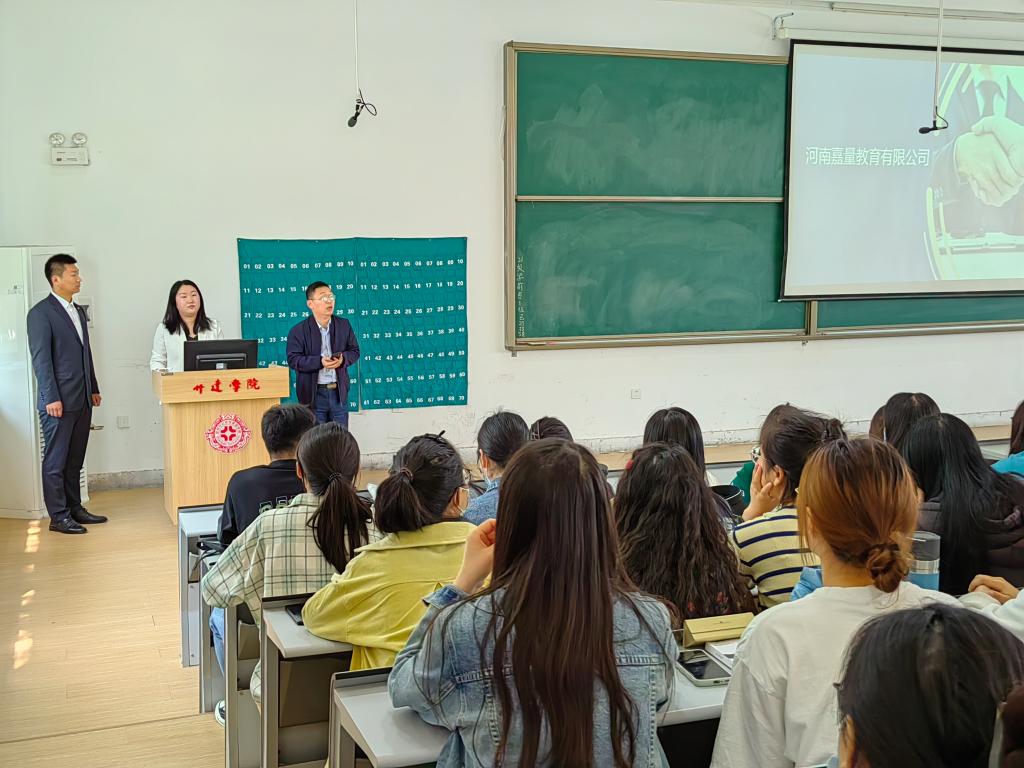 为促进学前教育专业毕业生高质量就业、搭建就业平台、拓展增加就业岗位,5月9日上午,文法学院特邀河南嘉量教育科技有限公司在教学1号楼118教室举办企业宣讲会。公司创始人赵宇芳、张佩,文法学院院长段丰乐、就业专员张甜梦、学前教育专业辅导员老师、学前教育专业学生代表参加此次宣讲会。