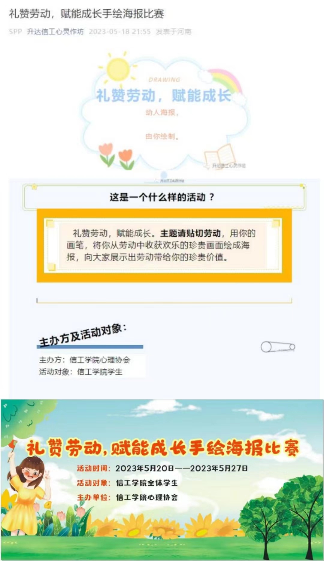 2023年5月20日至5月27日,信工学院心理协会开展“礼赞劳动 赋能成长”手绘海报征集活动。