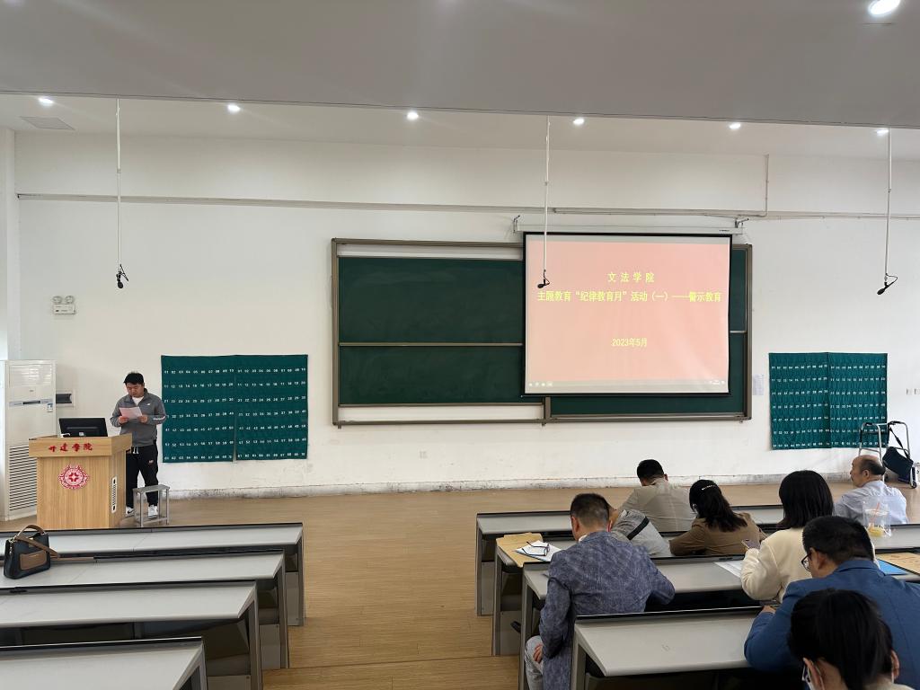 为深入学习贯彻党的二十大精神,持之以恒推进全面从严治党和党风廉政建设,按照学校“纪律教育月”活动通知要求,进一步提高教职员的廉洁自律意识,5月25日下午,文法学院组织全体教职员在教学1号楼118教室开展主题教育“纪律教育月”警示教育活动,全体教职员参加,会议由党委书记刘晓川主持。