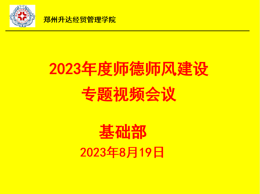 为深入学习贯彻习近平新时代中国特色社会主义思想主题教育,推进基础部教师师德师风建设,根据学校相关活动安排,基础部于8月19日上午组织开展专题视频会议,基础部主任王莉莉教授、副主任焦争鸣教授、书记张志银同志、各教研室主任、教学秘书和教学干事等参加了会议。会议由基础部党总支书记张志银同志主持。