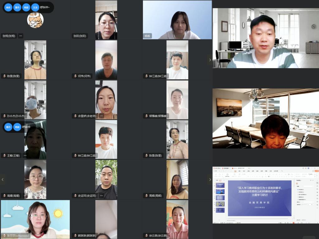 为落实新时代对广大教师立德树人根本任务提出的新要求,进一步增强教师的责任感、使命感、荣誉感,规范职业行为,明确师德底线,金融贸易学院8月19日在线上召开了《深入学习教师职业行为十项准则要求、加强教师思想政治和师德师风建设》专题会议。院长何伟、书记钟江鸽、副院长杨毅和全体专职教师、行政兼职教师参加了本次会议,会议由教学秘书张阳主持。