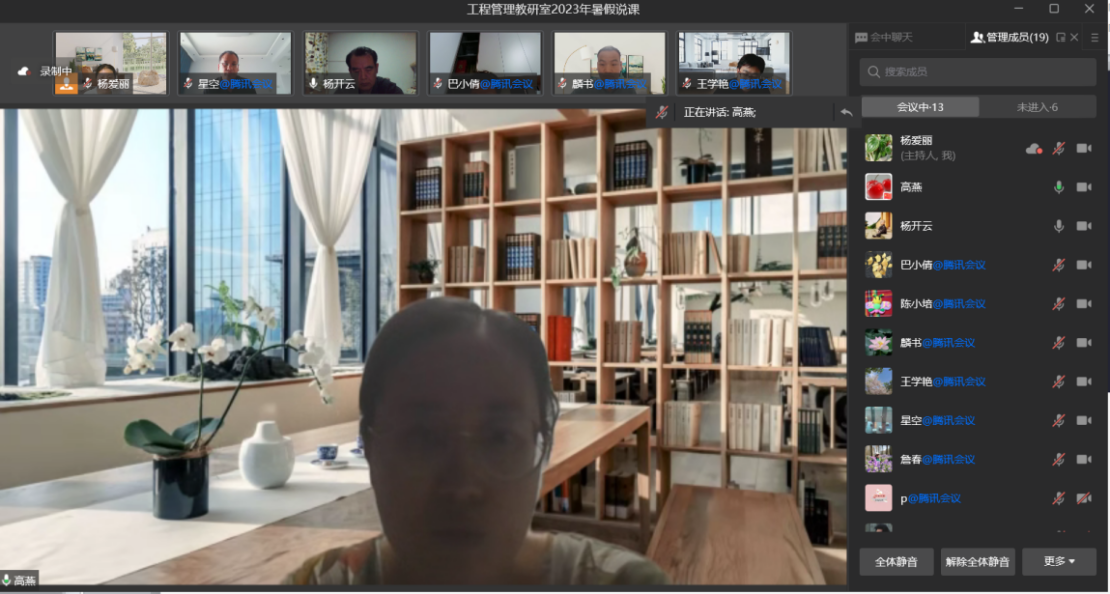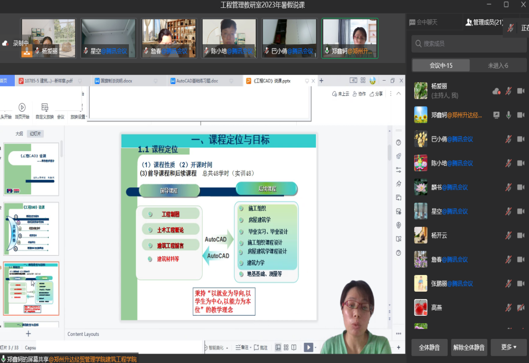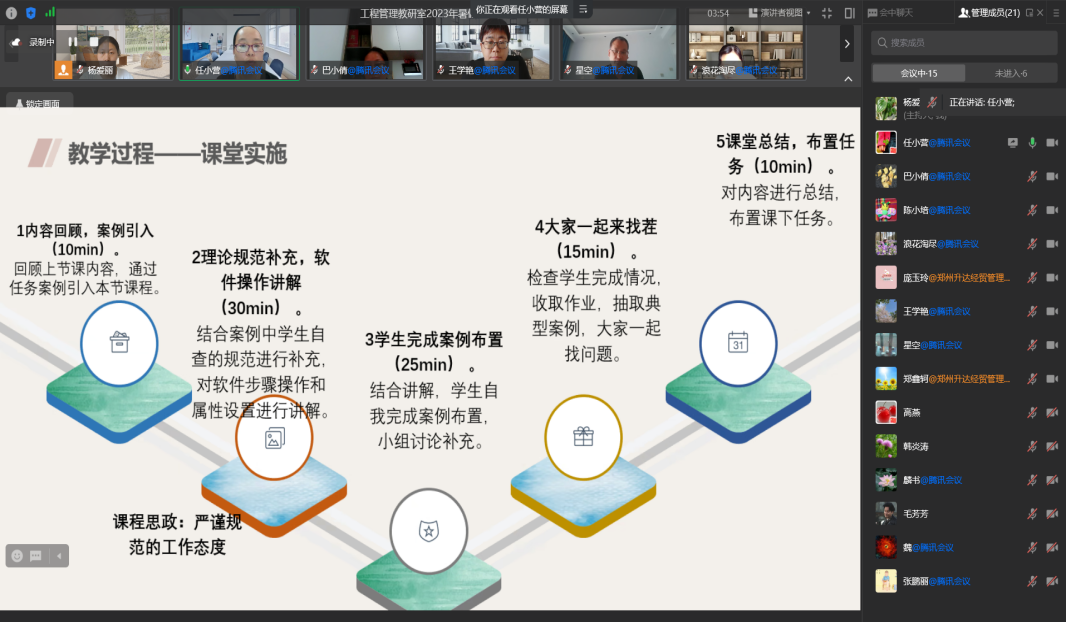 为了有效提升教师的教育教学能力,打造一支懂教研,善授课的专业化教师队伍,建筑工程学院工程管理教研室8月17日下午以网络会议形式组织本教研室14位专业课教师进行说课活动。本次活动由教研室主任杨爱丽主持,建筑工程学院院长杨开云、党委书记韩炎涛、副院长高燕参加并指导本次说课活动。