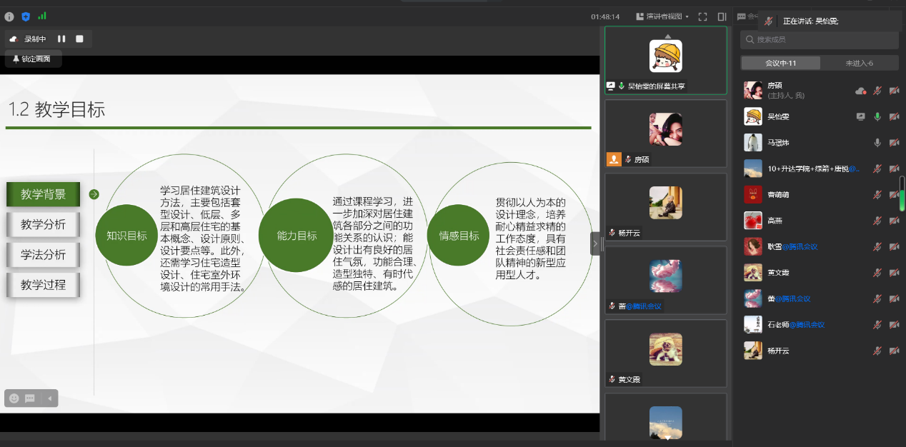 2023年8月18日,新学期开学前,建筑工程学院建筑学教研室组织全体专职教师就新学期的课程教学工作提前预热,开展说课教研活动。该活动采用网络会议的形式,由建筑学教研室主任房硕老师主持,邀请建工学院院长杨开云、副院长高燕莅临指导。