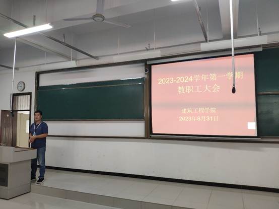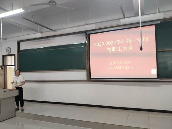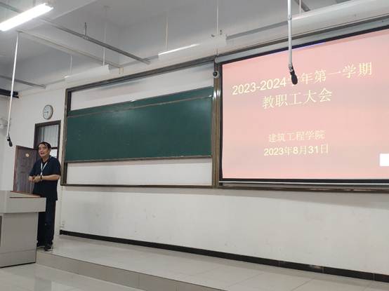 为保证新学期各项工作有序开展,8月31日建筑工程学院在建工楼610教室组织召开2023—2024学年第一学期全体教职工大会。会议由院长杨开云主持,学院党委书记韩炎涛、副书记兼副院长高燕、教学秘书齐雷、行政秘书支园园和全体教职工参加。