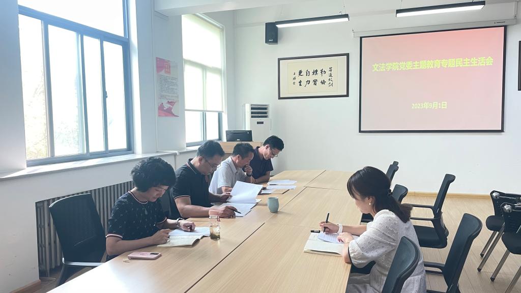 9月1日下午,文法学院党委在教学1号楼314会议室召开学习贯彻习近平新时代中国特色社会主义思想主题教育专题民主生活会,学院全体党委委员参加,会议由学院党委书记刘晓川主持。
