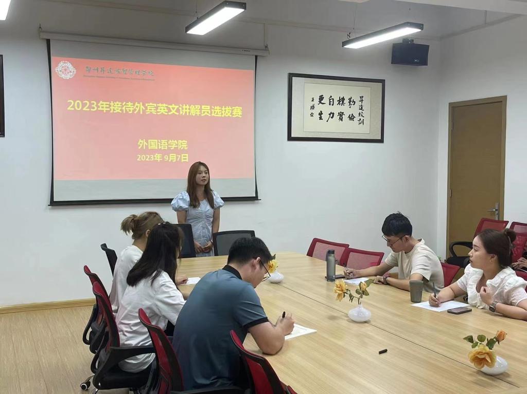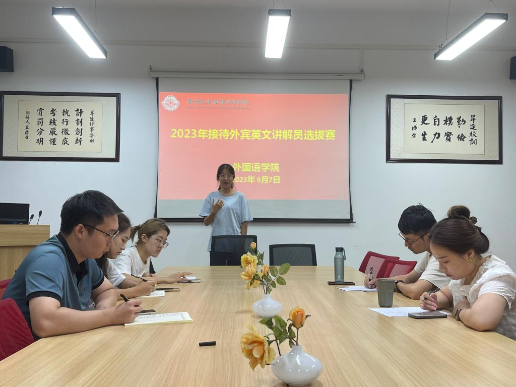 本次选拔赛于9月7日下午6点30分在学院206会议室举行,英语教研室承办,参赛同学共25名,分别来自英语23级专升本、22和21级英语专业各班级。评委教师有郭真、张怡琳、彭诚、刘林君和21级英本3班学生杜亦潇。经过激烈角逐,最终有吴艺戈、魏蓓佳、任中梅和曹莹莹等15位同学成功通过选拔。本次选拔赛旨在选拔出具备出色英文口语表达能力和专业知识的学生。参赛同学们经过比拼评选,展示了自己的语言能力、沟通技巧和知识水平。选拔过程中,评委老师们严格按照评分标准进行评判,综合考虑了同学们的口语流利度、发音准确性、年级背景和应变能力等方面。张怡琳老师对参赛同学们的表现给予了高度评价,认为同学们都表现出了自信风采和扎实的专业能力;曾参与过接待外宾工作的杜亦潇同学为此次参赛的学生们加油打气,分享了她的经历和经验,鼓励同学们要克服紧张情绪,自信大方,遇到沟通困难要从容应对,在近期还应积极主动学习学校历史,以扎实的专业基本功和热情开朗的态度迎接11月校庆活动的外宾接待工作。
