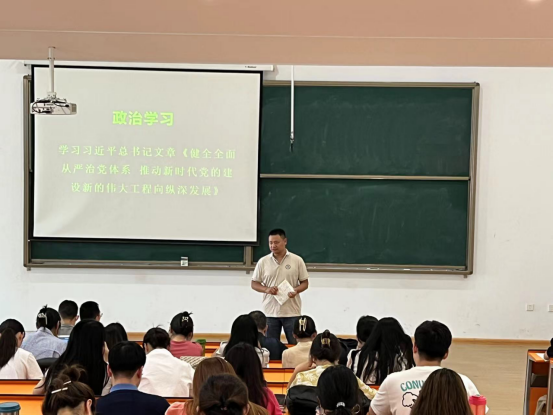 9月7日下午在2号教学楼116教室,商学院召开了政治学习会议,集体学习习近平总书记重要文章《健全全面从严治党体系推动新时代党的建设新的伟大工程向纵深发展》。商学院党委书记郭峰主持会议,全体教职工参会。