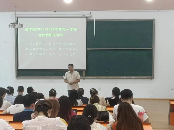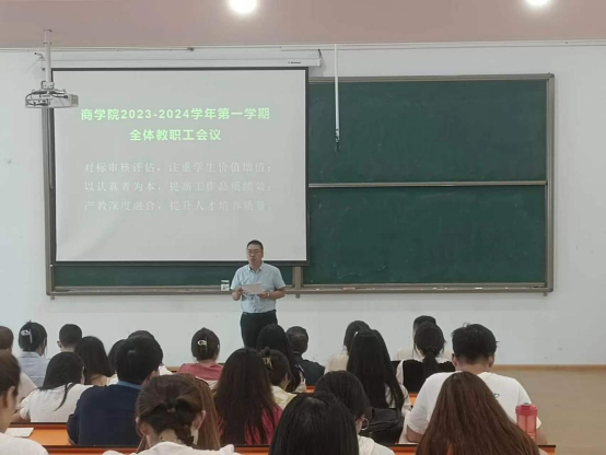 院长白朋飞对新学期的工作重点做出指示:“全体教职工对标审核评估,注重学生价值增值;以认真者为本,提高工作品质绩效;产教深度融合,提升人才培养质量。”第一,认真对待每一节课、每一份试卷和论文,要把教学基础工作做实做牢,注重学生在学校获得感和自豪感的培养。第二,认真对待本职工作,在教学、科研、学生论文指导过程中遇到问题与疑问,积极沟通与交流,提高工作效率。第三,为培养应用型商科人才,全体教职工要加深与企业合作,加强与企业联系,努力成为双师双能型教师。