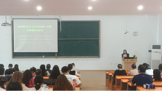新学年、新希望、新征程,9月7日下午,商学院在教学2号楼116教室召开新学期全体教职工会议,参会人员有院长白朋飞、党委书记郭峰、教学秘书马巧丽、行政秘书郗艳花以及全体教职员工,会议由教学秘书马巧丽主持。