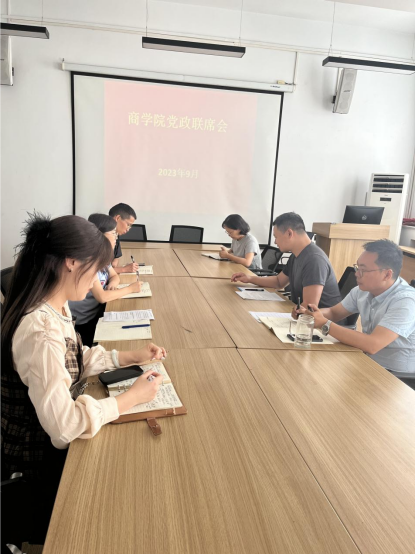 9月14日下午,商学院在2-315会议室召开党政联席会议,参加会议的人员有:党委书记郭峰、院长白朋飞、行政秘书郗艳花、教学秘书马巧丽、组织员杨利凯、党委委员胡好好、汪俊枝老师。