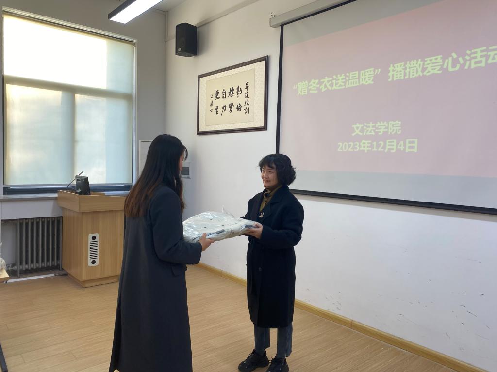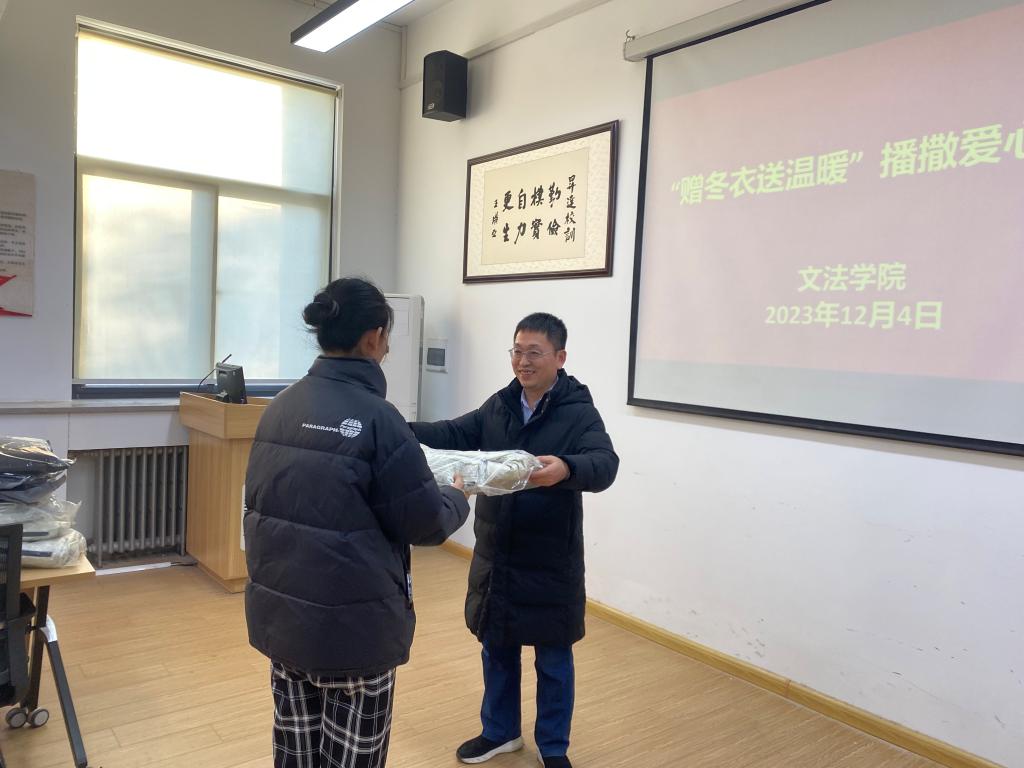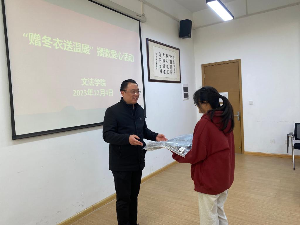 衣暖人心,温暖过冬。为健全资助育人体系,帮助家庭经济困难学生健康成长,让他们感受到实实在在的温暖,文法学院于12月4日开展了“赠冬衣送温暖”播撒爱心活动,文法学院院长段丰乐、党委书记刘晓川、行政秘书郑玲玲以及家庭经济困难学生代表参加了本次活动。