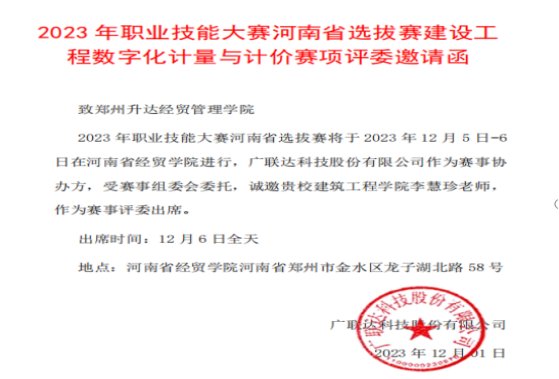 2023年12月6日,由河南省教育厅主办的“2023年职业技能大赛河南省选拔赛”(建设工程数字化计量与计价赛项)在河南经贸职业学院举行,本次选拔赛71组参赛选手来自河南省职业院校。我校建筑学院李慧珍应邀做为评委出席本次竞赛。