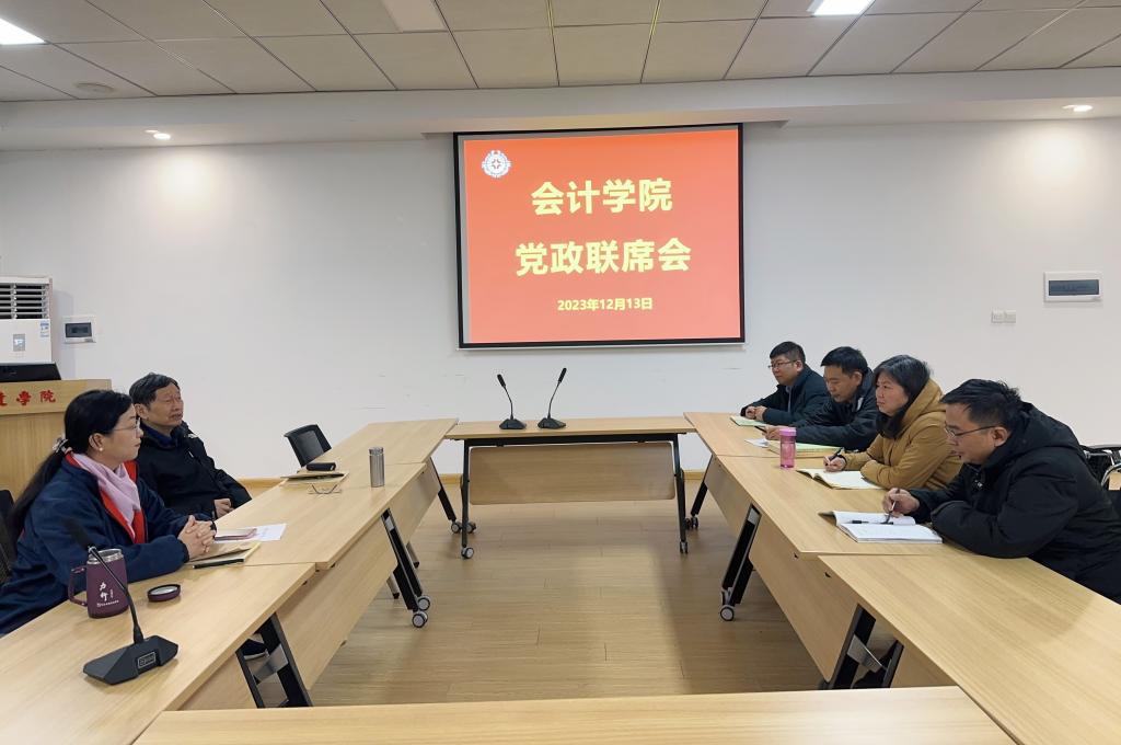 2023年12月13日,会计学院于4号楼209会议室召开党政联席会,会议对学院近期的重点工作进行了研究布置。院长张景空,院党委书记张蕾,副院长毕鹏翾、张新成,行政秘书陈刚,教学秘书李永利参加本次会议。会议由张蕾书记主持。