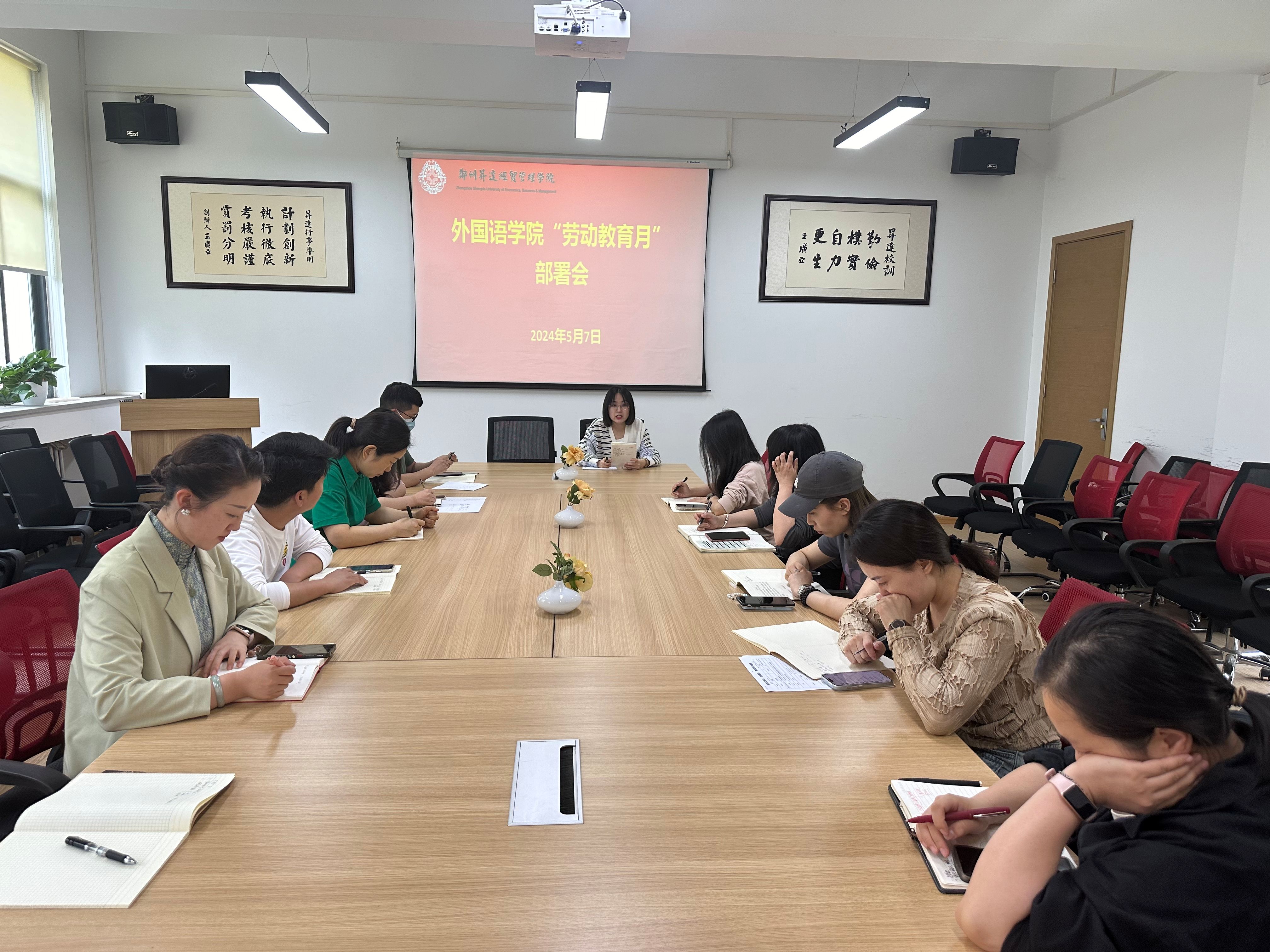 2024年5月7日,外国语学院在教一楼206院会议室召开“劳动教育月”工作部署会,以“践行劳动教育,助理乡村振兴”为主题,旨在弘扬勤俭、奋斗、创新、奉献的劳动精神,坚持以习近平新时代中国特色社会主义思想为指导,全面贯彻党的教育方针,培养德、智、体、美、劳全面发展的综合素质人才,引导学生树立正确劳动观,提高劳动积极性,外国语学院行政秘书丁玥主持会议,行政秘书丁玥以及各位辅导员老师参会。