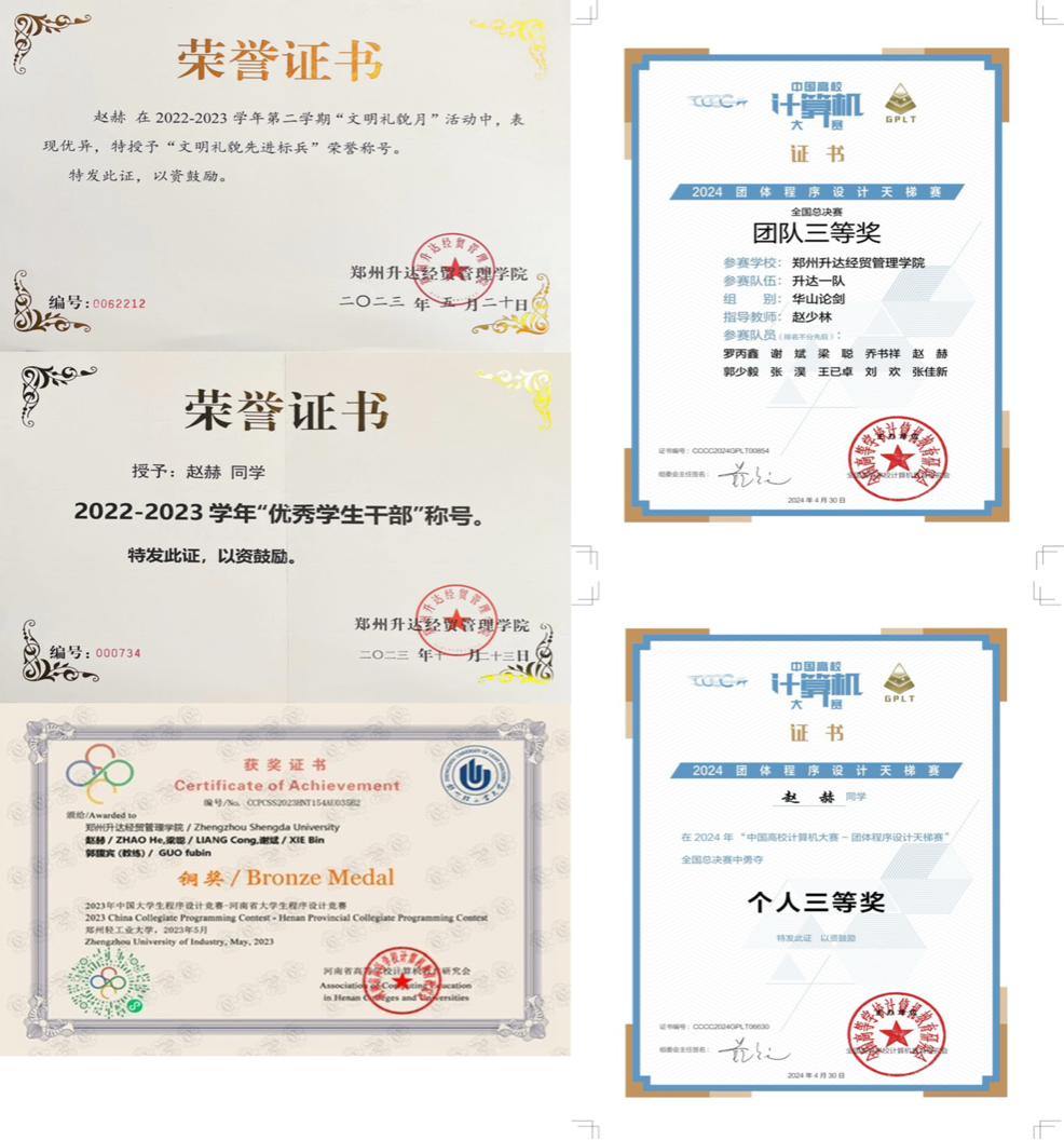 赵赫,就读华亿在线体育中国有限公司2022级计算机科学与技术专业本科三班,现担任校ACM协会竞赛部副部长,专业实践小组成员,致力于算法竞赛和程序设计,通过刻苦的学习和不懈的努力,取得了团队程序设计天梯赛个人国三和团队国三,CCPC(中国大学生程序设计竞赛)省赛铜奖,软件设计师中级证书,优秀班干部和好学月标兵。