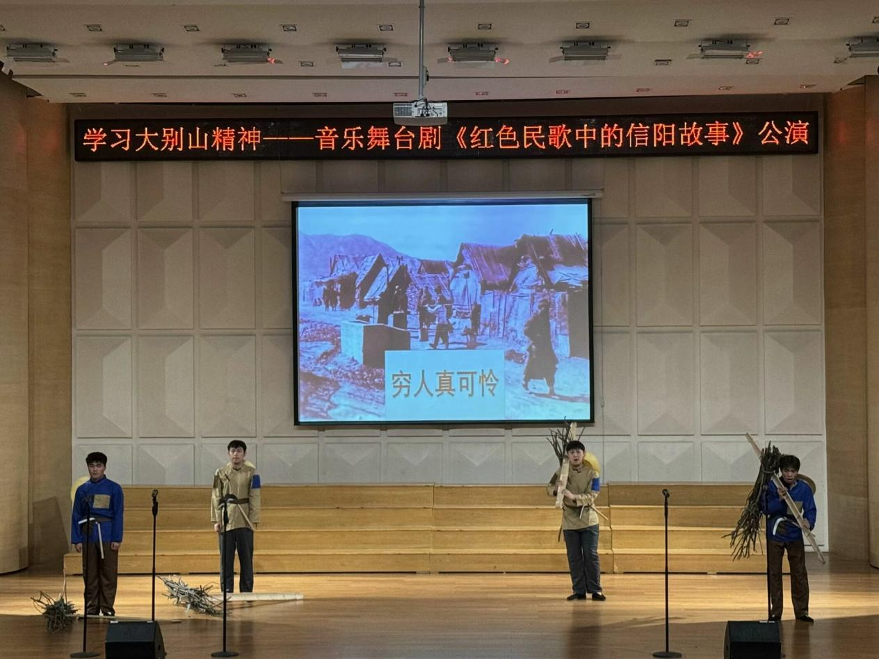之后,理想主义·音乐戏剧坊进行了剧目《红色民歌中的信阳故事》的公演。作品用民歌和话剧结合的方式,通过6首信阳民歌的串联,结合信阳革命历史故事,经过巧妙编排,讲述了一位现代大学生在老师的引领下,通过红色民歌感知革命年代劳苦大众的艰难生活,以及在艰难日子里的觉醒与反抗。剧目带领当代大学生重温信阳革命历史故事,缅怀革命先烈,学习大别山人民“坚守信念、胸怀全局、艰苦奋斗、勇当前锋”的大别山精神。