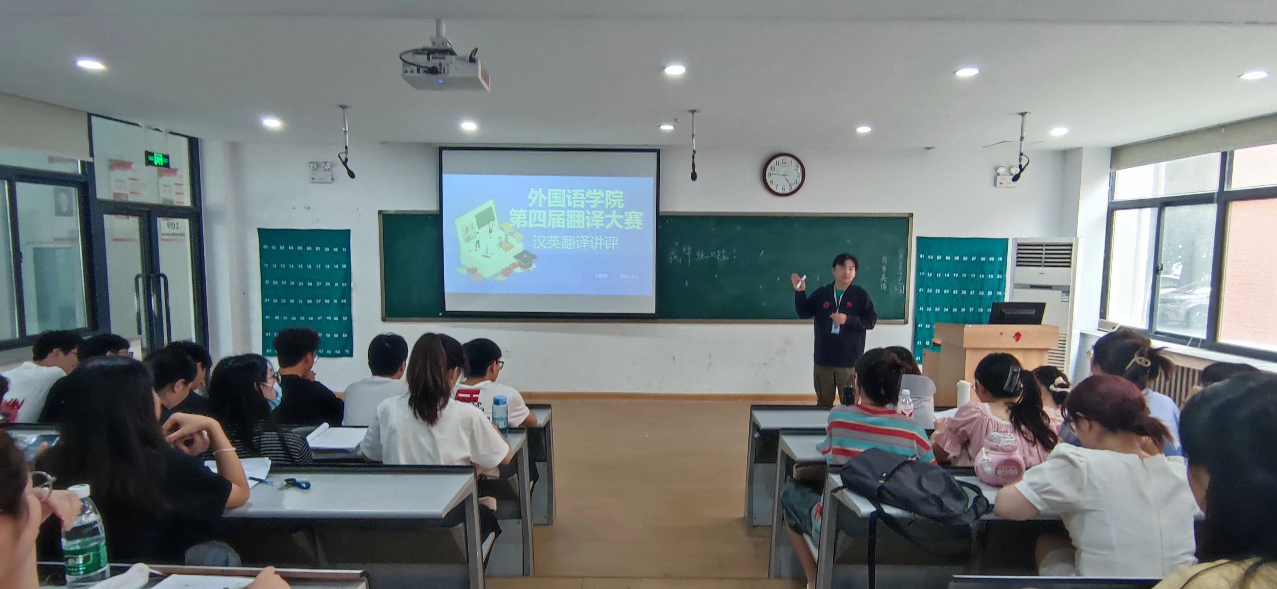 2024年6月4日、5日下午,翻译教研室教师王余成、王明伟先后在教学1号楼109教室为参加本次翻译大赛的学生做了英译汉部分及汉译英部分的赛题讲评。