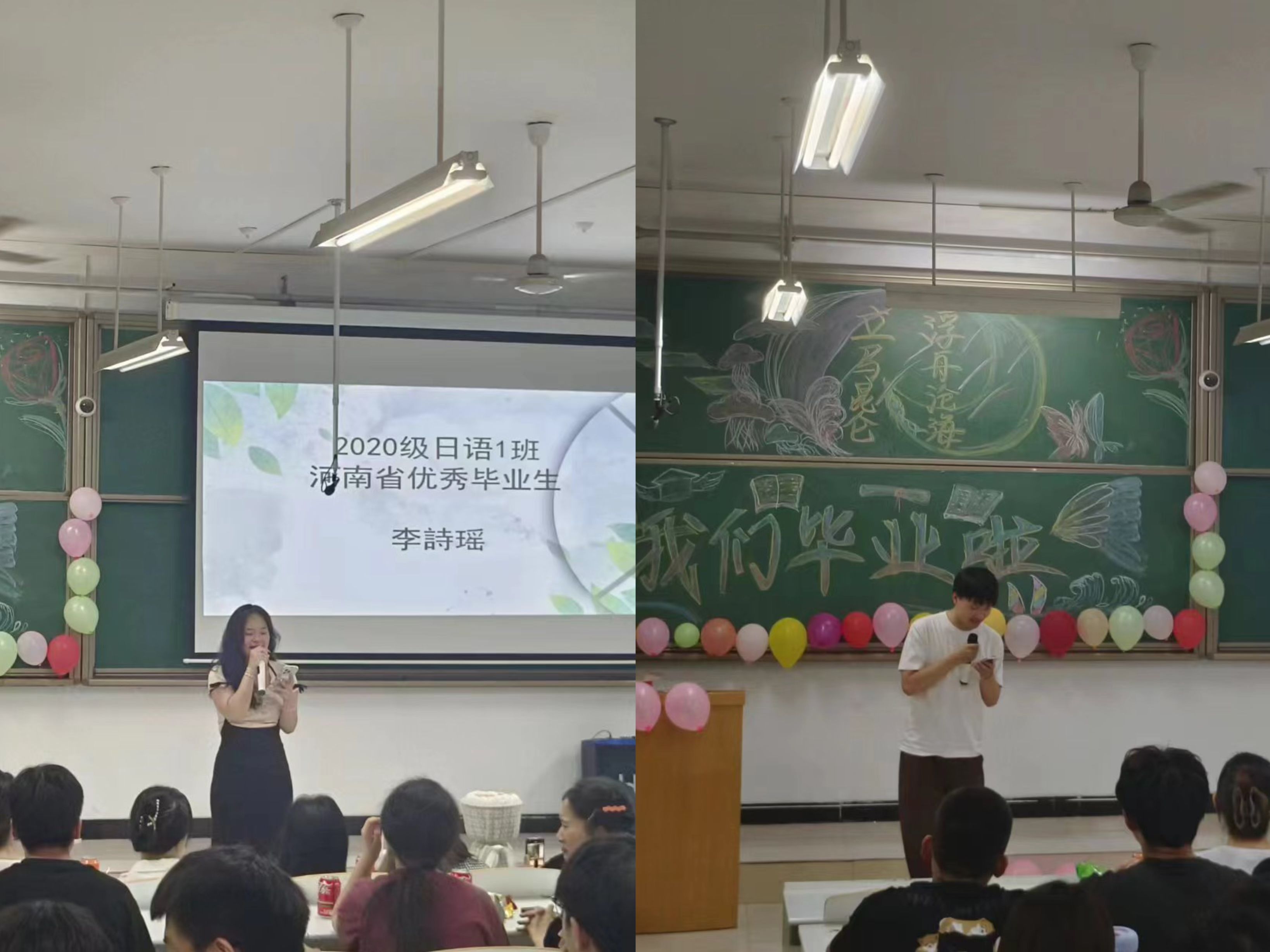 在温馨感人的氛围中,由2020级河南省优秀毕业生代表李诗瑶和2022届日语2班的崔芸博学长发表演讲,给晚会画上了圆满的句号。