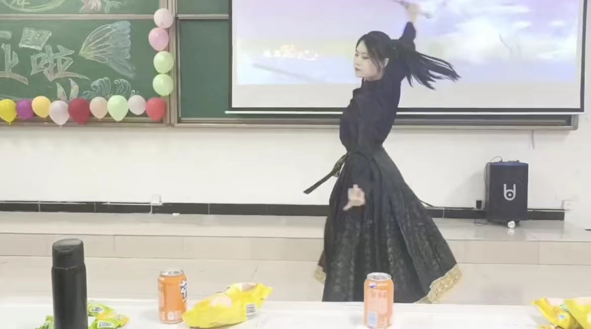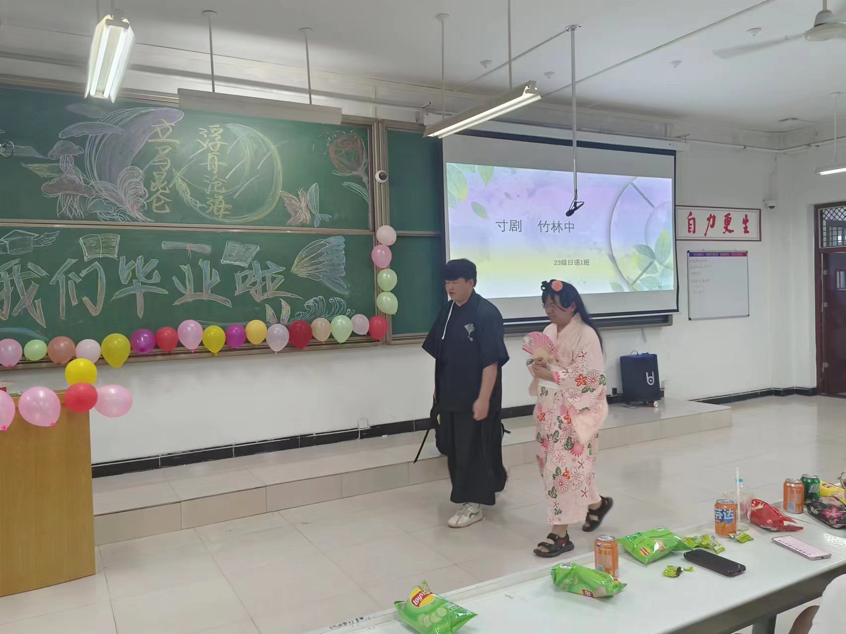 随后,一系列精彩纷呈的节目轮番上演,包括歌舞、戏曲、寸剧等多种形式,展现了日语专业师生的才华与活力。特别值得一提的是,由学生自编自导自演的寸剧《竹林中》赢得了满堂喝彩,大一的学弟学妹们以幽默风趣的方式展现了日本文化,引发了现场观众的强烈共鸣。而舞蹈《天地似无情》则以其动感的节奏和优美的舞姿,诠释了毕业生们对未来的无限憧憬和坚定信念。