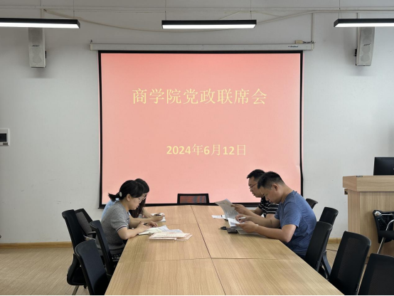 6月12日上午,商学院召开党政联席会议,会议围绕二级学院目标管理中期考核、招生宣传、期末考试、安全稳定等工作展开。参会人员有院长白朋飞、党委书记郭峰、教学秘书马巧丽、行政秘书郗艳花。