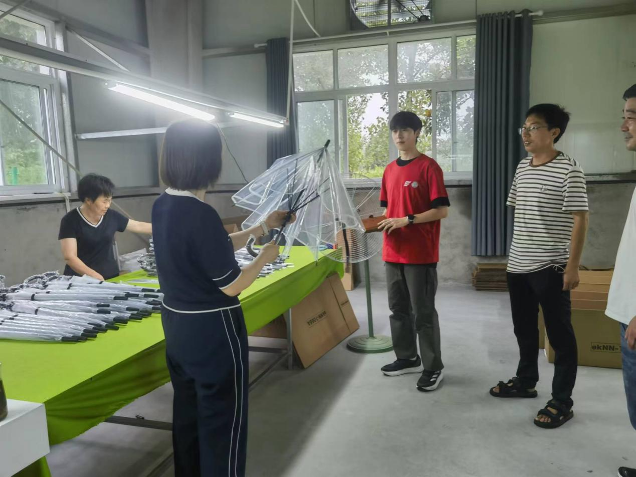 在调研实践途中,队员们发现镇上分布着很多个加工车间,于是提出:“腰店镇在短短几年内,如何能发展这么多雨伞厂?”李书记和乡亲们的共同回答是:“党建引领、龙头带动,组织不动、啥也没用”。李书记还向队员们介绍了腰店雨伞“1+N”产业的未来计划:要实现全镇“村村有雨伞厂点、户户能生产配件、人人是做伞能手”,迅速建成腰店“雨伞小镇”,努力争创中原“雨具之乡”。