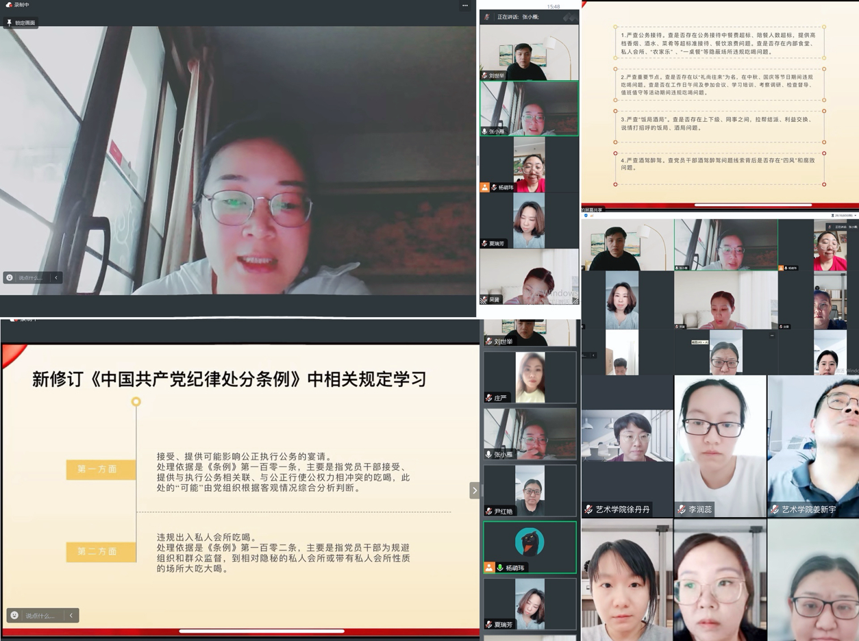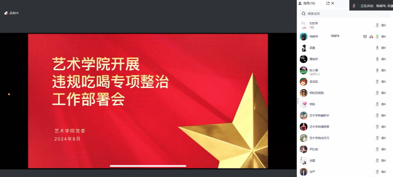 为深入学习贯彻二十届中央纪委三次全会关于专项整治违规吃喝的决策部署,贯彻落实省纪委监委关于在全省开展违规吃喝专项整治“百日行动”的工作要求,巩固深化党纪学习教育成果,坚决纠治享乐主义奢靡之风,狠刹违规吃喝歪风,进一步严肃工作纪律,强化作风建设,营造风清气正良好氛围。8月1日下午,艺术学院党委线上组织召开违规吃喝专项整治工作安排部署会。本次会议由艺术学院党委书记张小雁主持,艺术学院党委委员会成员、各党支部书记参加本次会议。