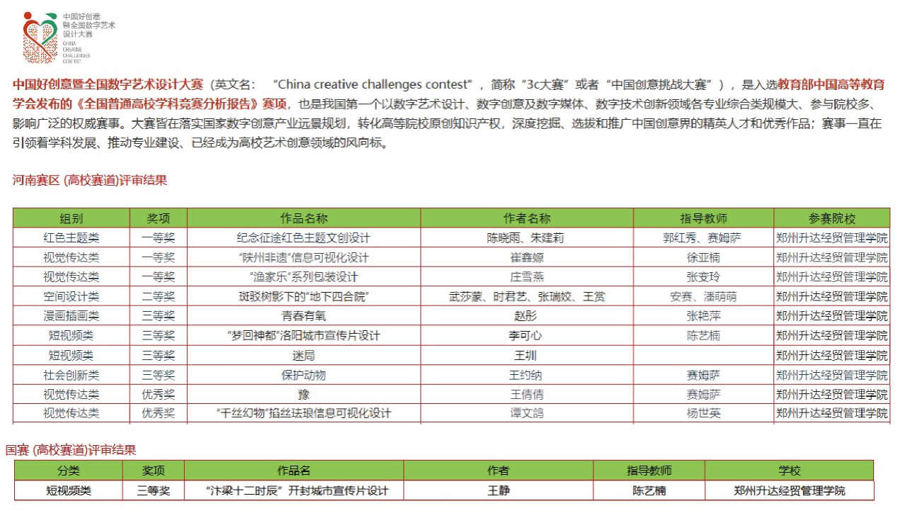 艺术学院近几年来坚持“以赛促教、以赛促学”的教育教学理念,鼓励支持帮助广大教师学生积极参加各类比赛,通过参加各大设计竞赛提高了学生的专业设计技能,增强了教师实践教学的水平和能力,激发了学生创新创意能力的有效发挥。未来,艺术学院全体教师和同学将不负众望,继续努力,为升达增光添彩,再创辉煌!