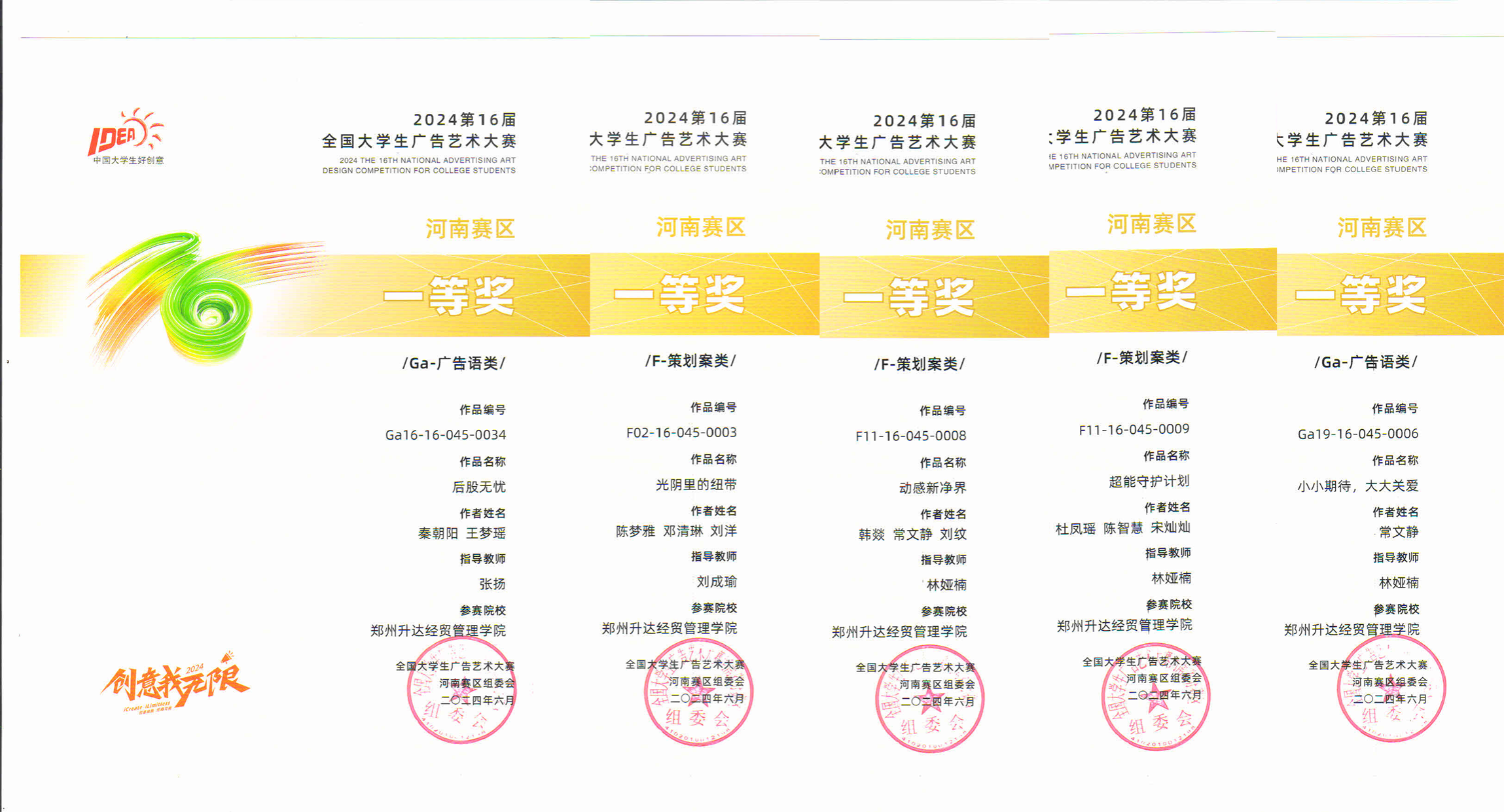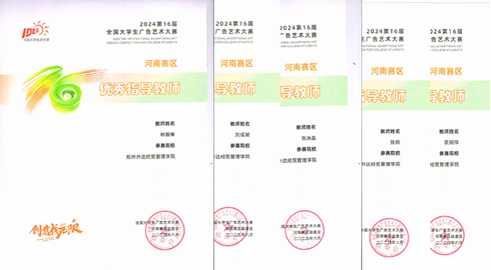 本次比赛我校商学院参赛作品数量创历史新高,共报送作品378件,充分展现了学生们的创新思维和专业能力。经过激烈角逐,获奖总数达到55个,其中林娅楠老师指导韩燚同学组、杜凤瑶同学组、常文静组,张扬老师指导的秦朝阳同学组,刘成瑜老师指导的陈梦雅同学组获得河南省一等奖5项,另获得二等奖21项,三等奖26项,这一成绩彰显了商学院在广告和营销策划教育方面的卓越成效。