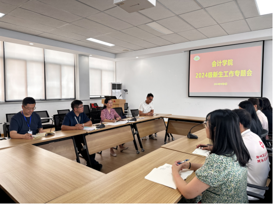 9月6日上午11时,会计学院在教学四号楼209会议室召开2024级新生工作专题会,全面总结新生入学后的相关工作,查缺补漏并规划后续工作。院党委书记张蕾、行政秘书兼团委书记陈刚及全体新生辅导员参会。