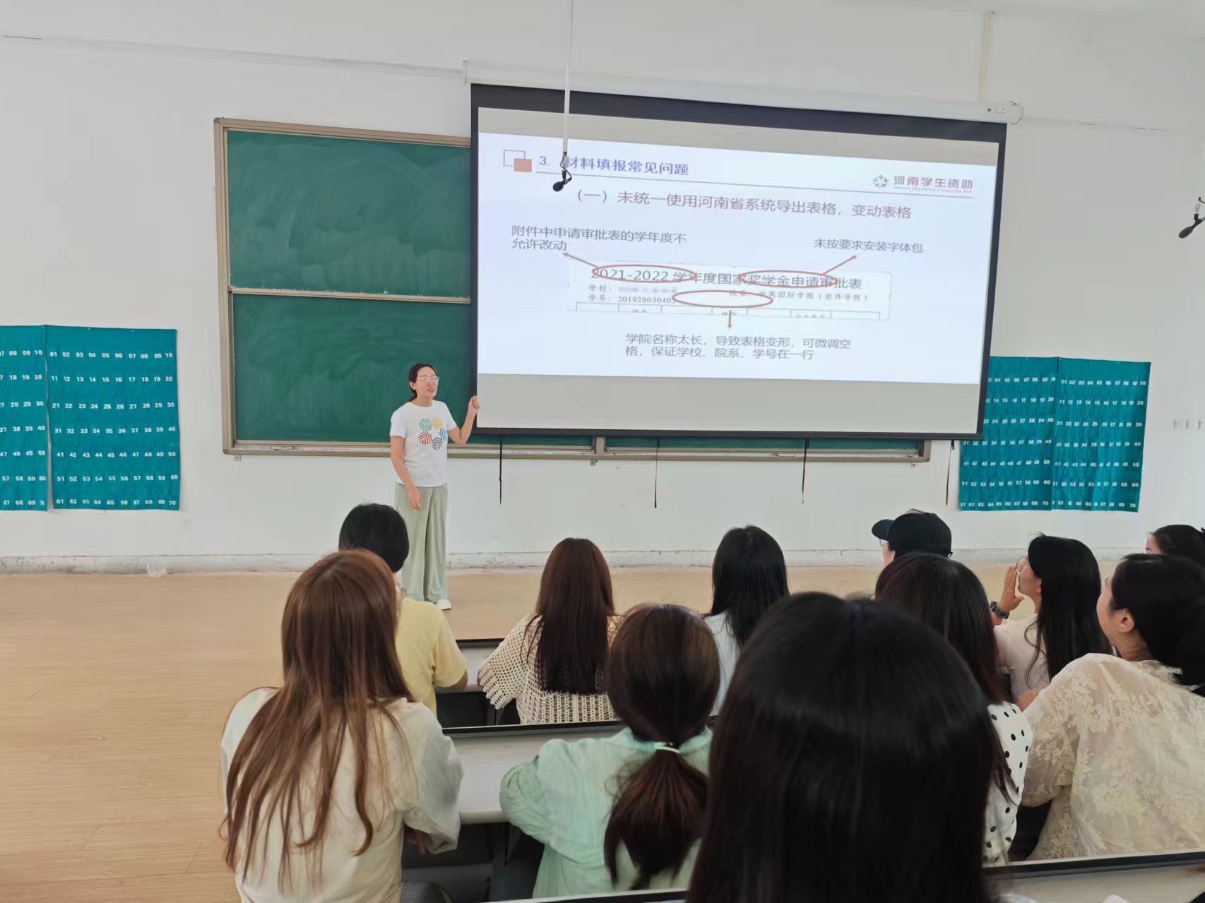 资助专员周怡帆结合校学生资助中心下发的学生信息完善、辅导员操作指南、河南省高校学生资助管理信息系统应用PPT、高校助学贷款学生在线注册和申请PPT、高校助学贷款业务系统应用PPT、国家奖助学金材料填报常见问题PPT、服兵役国家教育资助政策解读PPT等相关资料,与辅导员进行了共同探讨和问题解答,有效的提升了辅导员的工作能力。