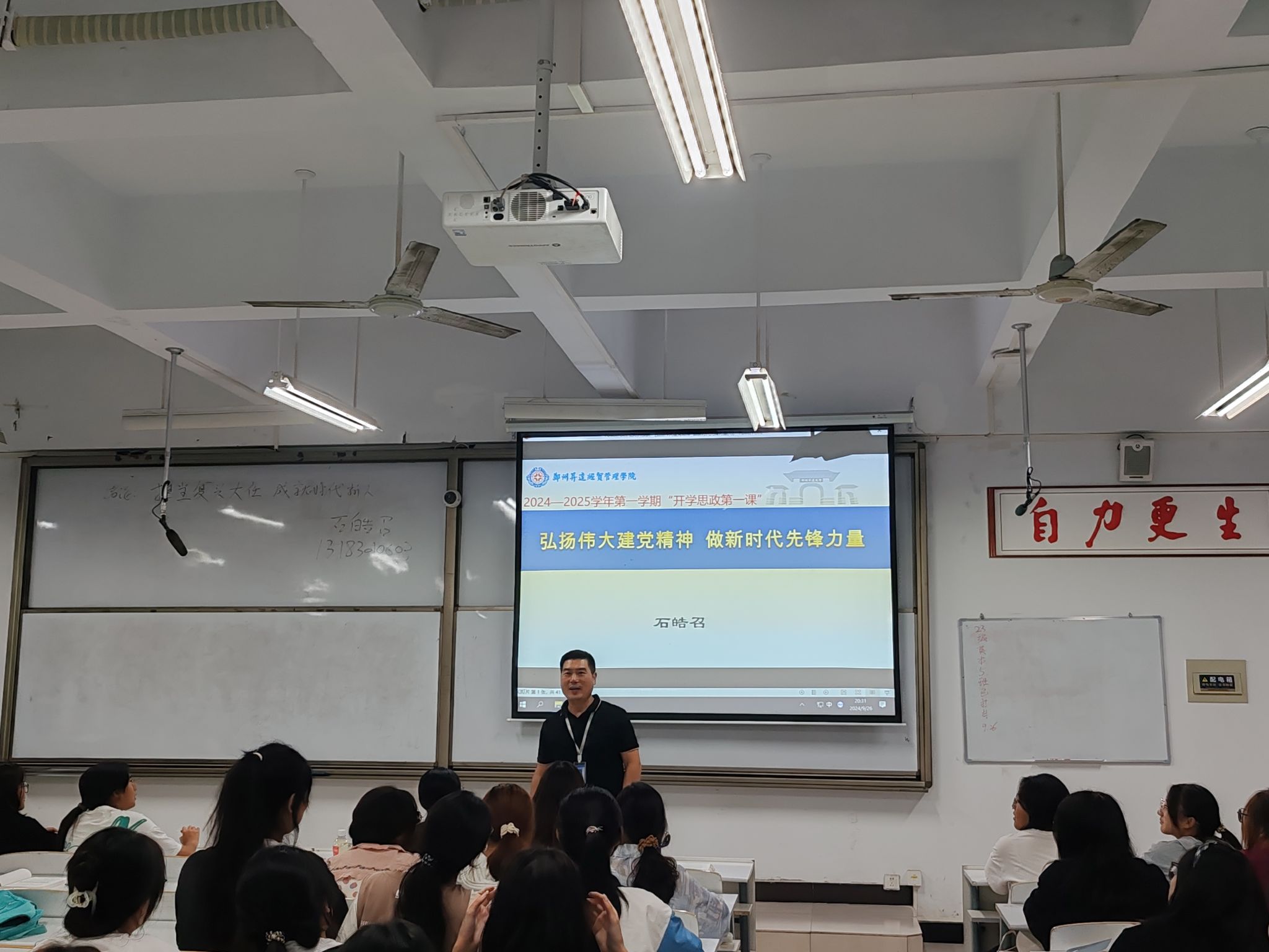 2024年9月26日晚,按照校党委的统一工作部署,外国语学院党委书记石皓召同志,在教学楼内为2024级英语本科三、四班的同学们带来了秋季学期的第一堂思政课——《弘扬伟大建党精神 做新时代先锋力量》。此次授课旨在深化学生对中国共产党历史的理解,激发其爱国情怀与奋斗精神,为新学期的学习生活奠定坚实的思想基础。