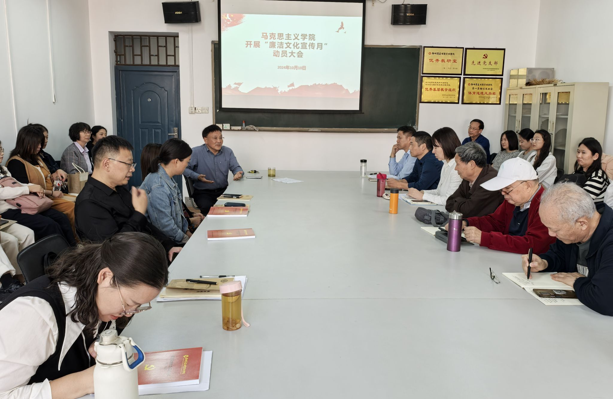 10月10日下午,按照学校《关于组织开展“廉洁文化宣传月”活动的通知》安排和部署,马克思主义学院在综合楼211会议室召开了“廉洁文化宣传月”动员大会。学院院长程明欣、党委书记窦峰、副院长何涛、教学秘书苗淑娟和全体教师参加会议。