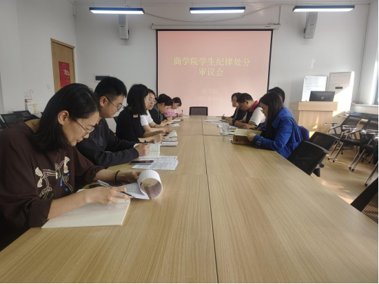 10月15日下午,商学院召开学生纪律处分审议会,对违纪学生的处分工作进行研究审议。学院党委书记郭峰、院长白朋飞、行政秘书郗艳华、教学秘书马巧丽以及相关辅导员老师、教师代表和学生代表参加会议,会议由行政秘书郗艳花主持。