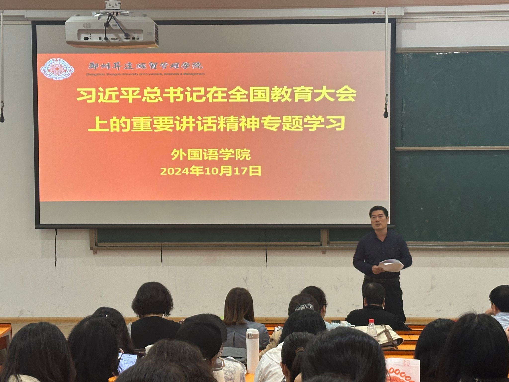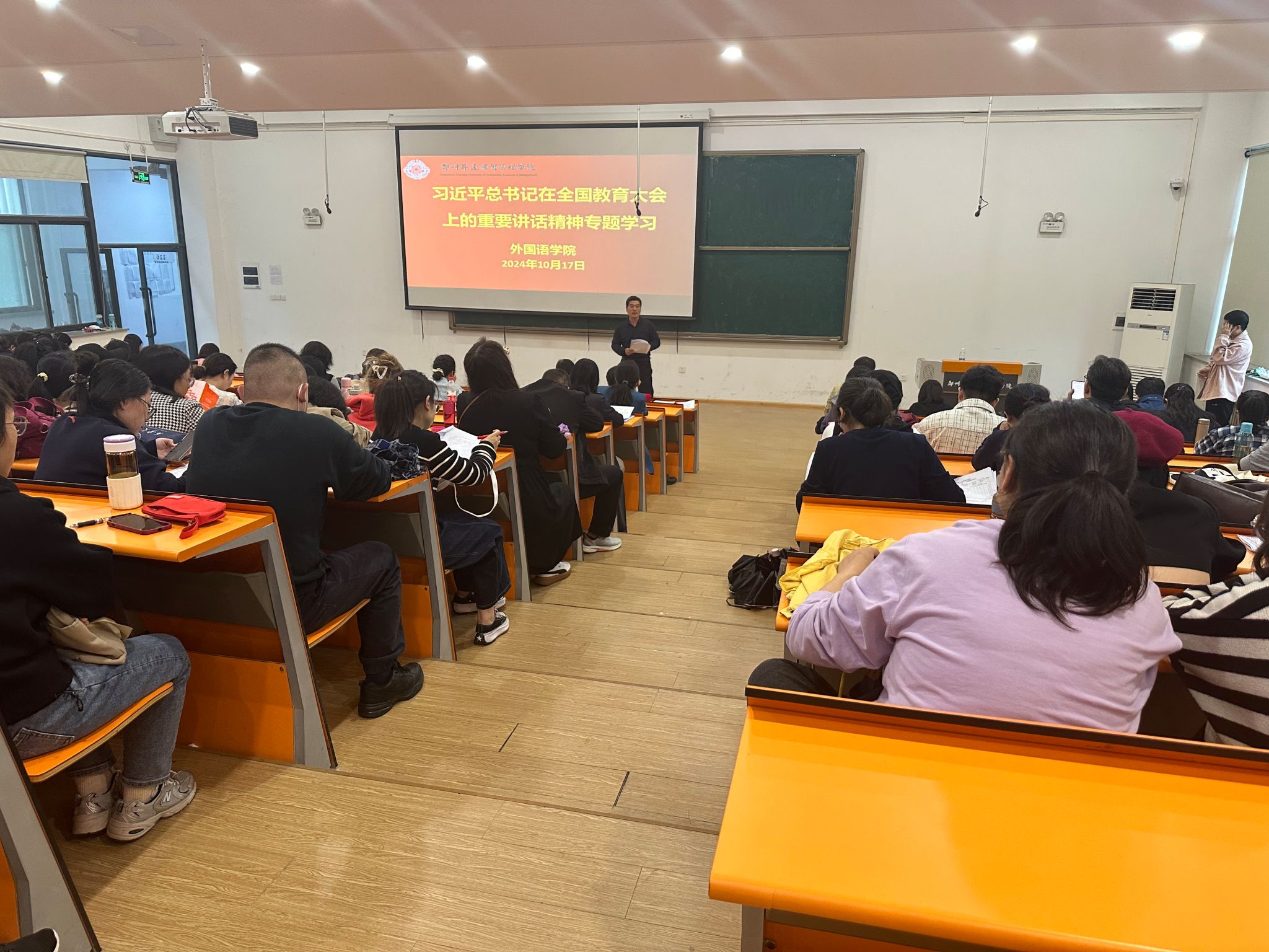 2024年10月17日,外国语学院组织党委书记石皓召同志组织全院教职工共同学习了习近平总书记在9月9日召开的全国教育大会上的重要讲话精神。会议在教学二号楼116阶梯教室举行,外国语学院全体教职工参加会议。此次会议旨在让全体教职工深刻理解和把握教育在国家发展中的重要性,以及新时代对教育工作的新要求。