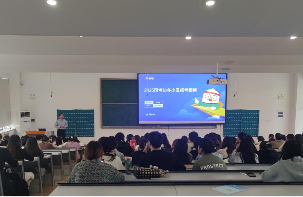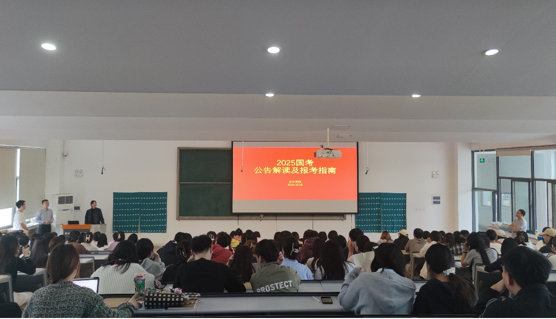 2024年10月16日下午,文法学院于教1楼118教室举办2025年国家公务员考试公告解读及报考指南培训会,以进一步推进高质量就业工作,指导学生科学备考公职类考试,提升报考积极性。本次活动由粉笔教育刘海旭老师主讲,就业专员吕凌云老师主持培训会。