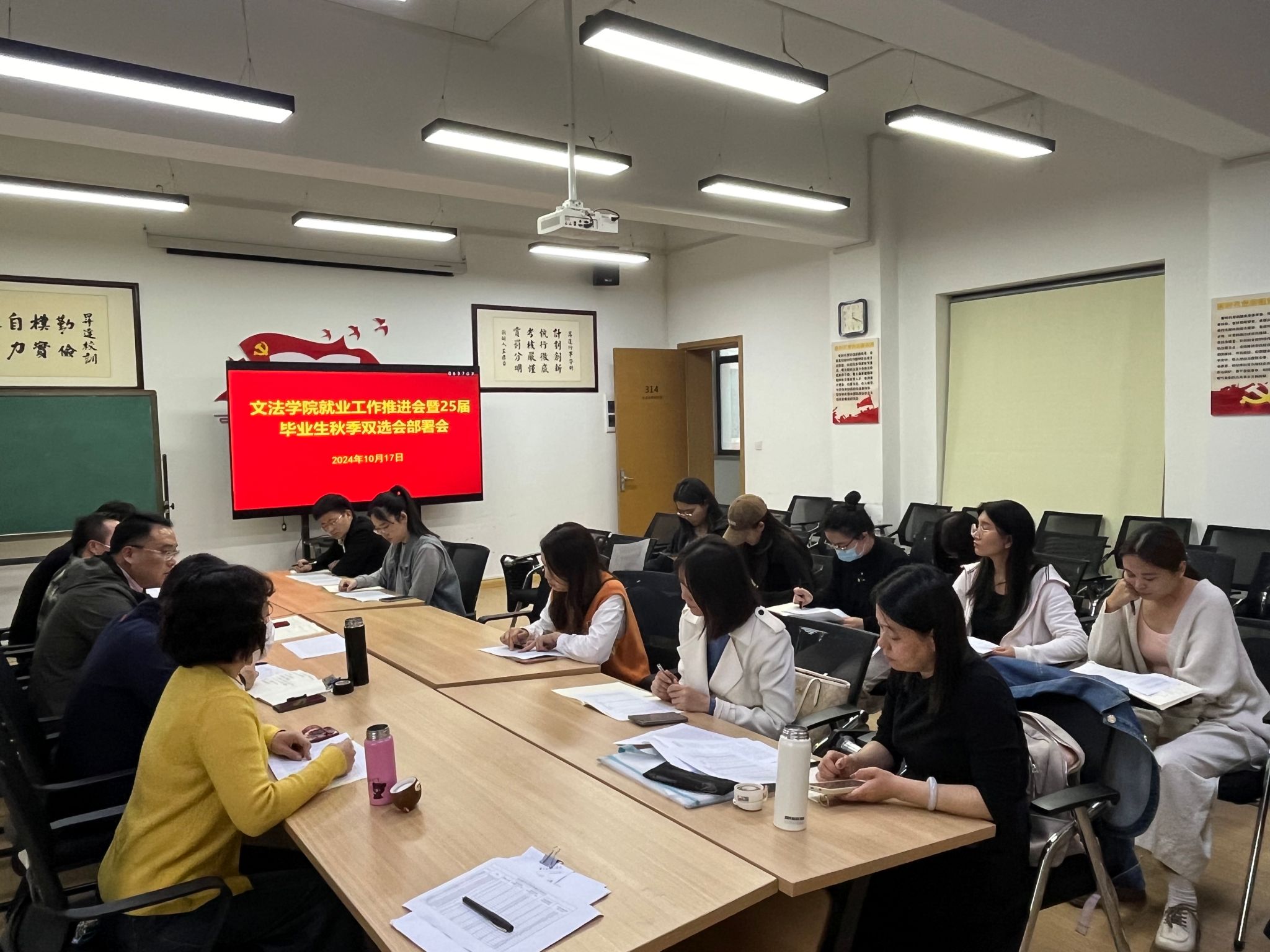 2024年10月17日下午,文法学院于教1楼314召开毕业生就业工作推进会,旨在继续做好2024年毕业生就业工作,落实就业目标责任,并安排部署2025届毕业生秋季招聘会。文法学院院长段丰乐、党委书记刘晓川、副院长赵严俊、行政秘书郑玲玲、教学秘书李南方、教研室支部书记以及2024届与2025届全体毕业班辅导员出席会议,会议由就业专员吕凌云主持。