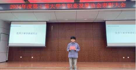 鲁老师的一番话鼓舞人心,催人奋进,让人倍感亲切,像大海中的航行灯给我们指明了方向。接下来便到了优秀干事李善谋上台发言。在他看来这份荣誉是肯定、责任与鞭策。他体会到宣传工作重要性,感谢就业处老师、部长及同学,并表示会继续努力,与大家携手共创职协辉煌未来。